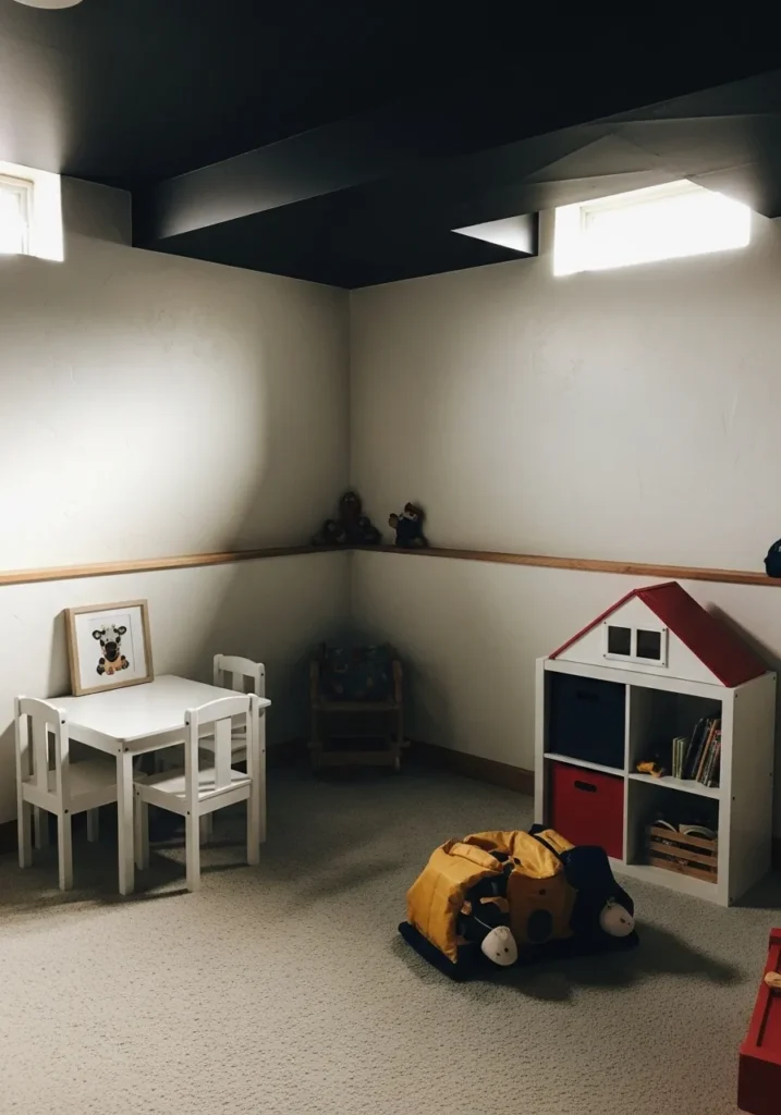 This basement play area uses a black ceiling to visually contain the space while keeping the walls light and cheerful. Simple furniture and open floor space make it practical, and the ceiling helps hide marks and wear over time.