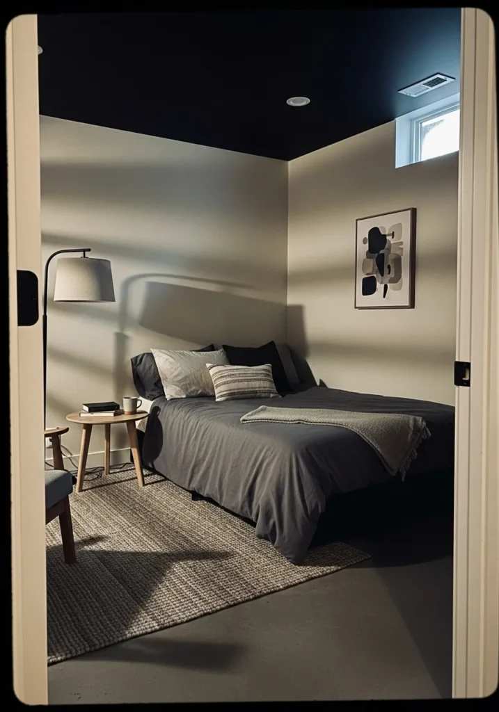 This basement bedroom uses a black ceiling to create a snug, restful atmosphere. Soft neutral walls, layered bedding, and gentle lighting keep the space feeling calm and balanced. The ceiling adds contrast without overpowering the room.