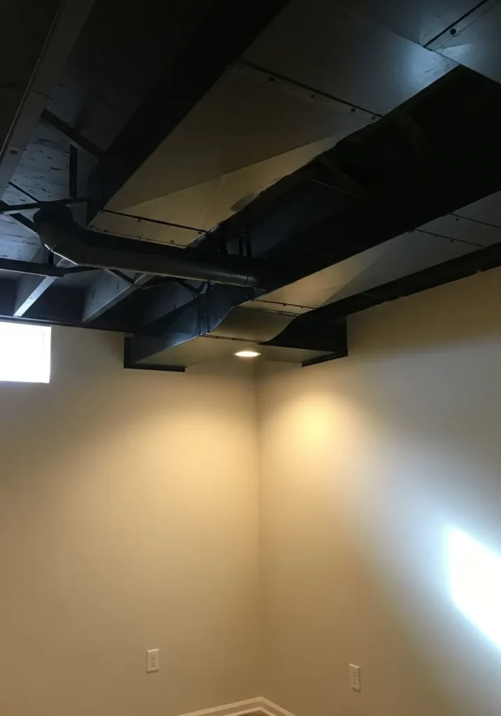 This basement keeps things simple with a black ceiling paired with warm, light walls that reflect natural light from the small window. The ceiling visually pulls everything together while keeping pipes and beams discreet. The open layout makes the space feel flexible and ready for many uses.