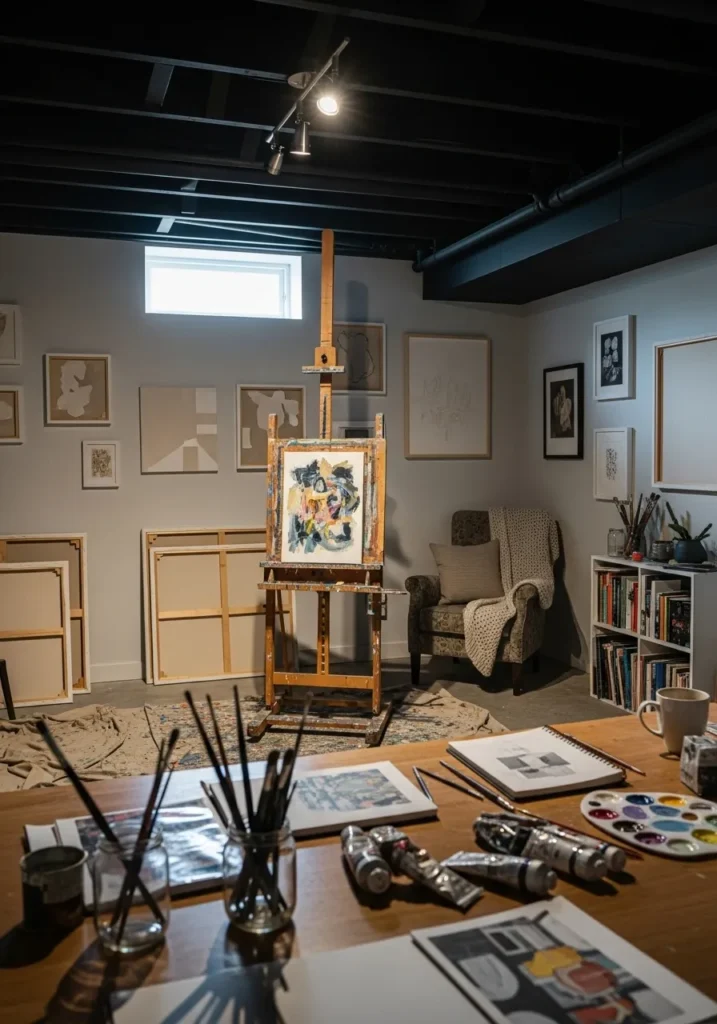 This basement studio uses a black ceiling to frame the creative workspace and make the room feel focused. Art supplies, shelving, and a work table fill the space in a lived in way, while the ceiling keeps everything visually grounded. The lighting feels soft and practical.