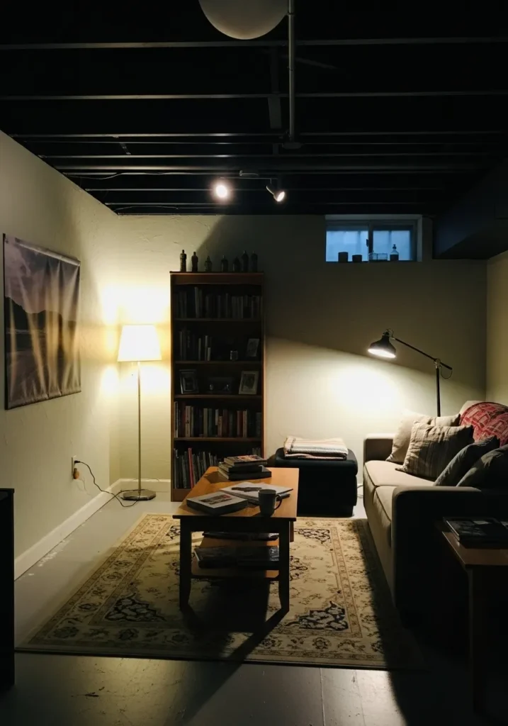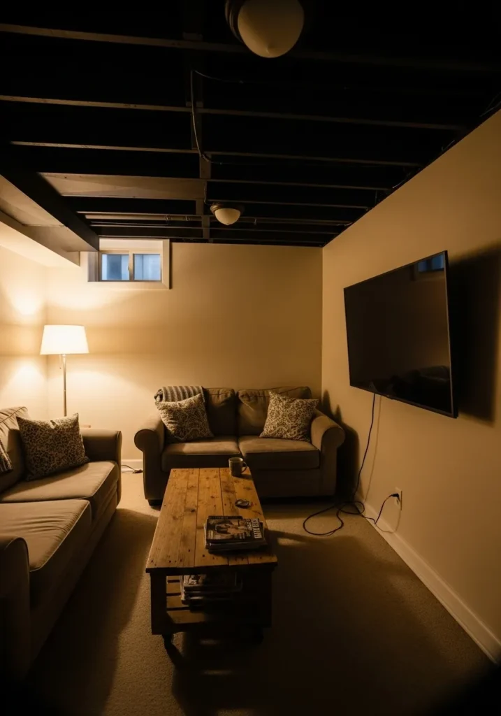 Cozy Basement Living Area With Black Ceiling