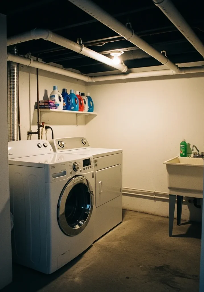 This basement laundry room uses a black ceiling to add contrast and hide exposed elements above. Light walls and simple appliances keep the space clean and functional, while the ceiling adds a modern edge. It feels practical but not boring.