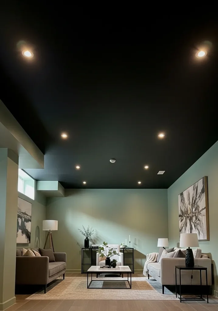 I used to think black ceilings were risky until I saw how stylish they can look in a basement when paired with the right wall color.