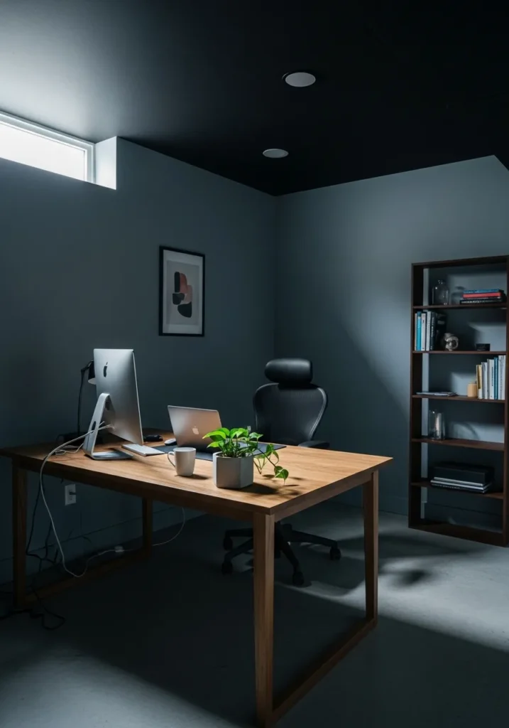 Home Office With Black Ceiling and Soft Light
