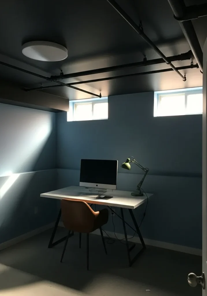 This basement office uses a black ceiling to visually separate the workspace and make it feel focused. Light colored walls and a simple wood desk keep the room from feeling boxed in. Natural light from the small window adds just enough brightness to balance the darker ceiling.