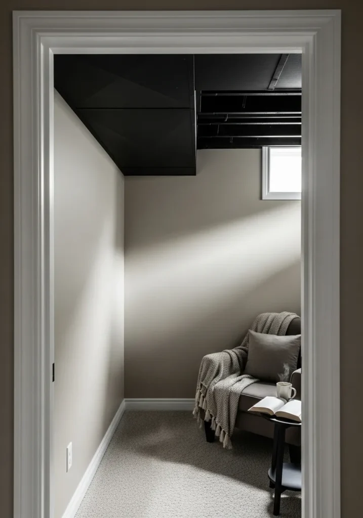 This small basement lounge uses a black ceiling to frame the space and give it a cozy, tucked away feel. Light walls and a soft armchair keep the room from feeling tight, while the darker ceiling visually lowers the height in a way that feels intentional. The doorway acts almost like a picture frame, drawing you into the space.