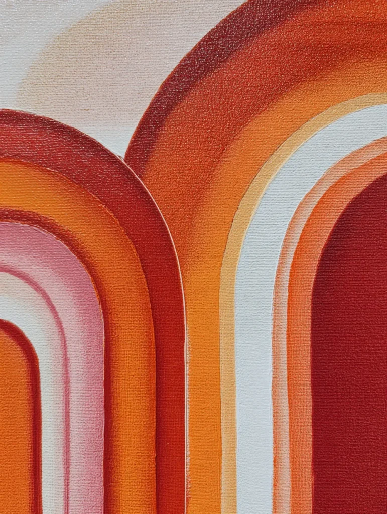 This design features a gorgeous stack of curved shapes that look like a stylized 70s sunset. The palette is a dream for anyone who loves warm tones, blending deep terracotta red with burnt orange, soft peach, and a pop of rosy pink. Each arch is painted with smooth and steady strokes that follow a precise, rounded path. The composition feels very balanced and rhythmic, with the shapes overlapping to create a sense of depth against a creamy off-white background.