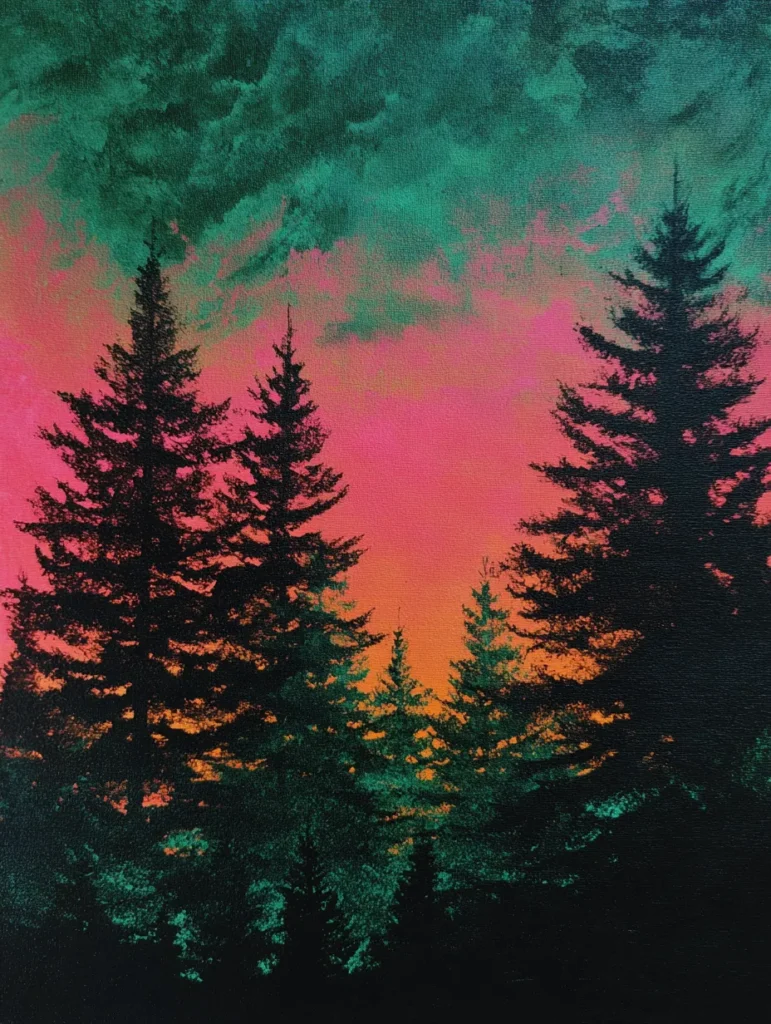 I admire how this neon palette gives a classic nature scene such a trendy and modern twist. Painting this is a total joy because you get to play with bold color blending in the sky before adding those satisfyingly dark tree shapes. It feels like a wonderful way to experiment with high contrast while creating a piece that looks like a magical forest at dusk. You will love how this vibrant artwork adds a pop of personality and mystery to your bedroom wall.