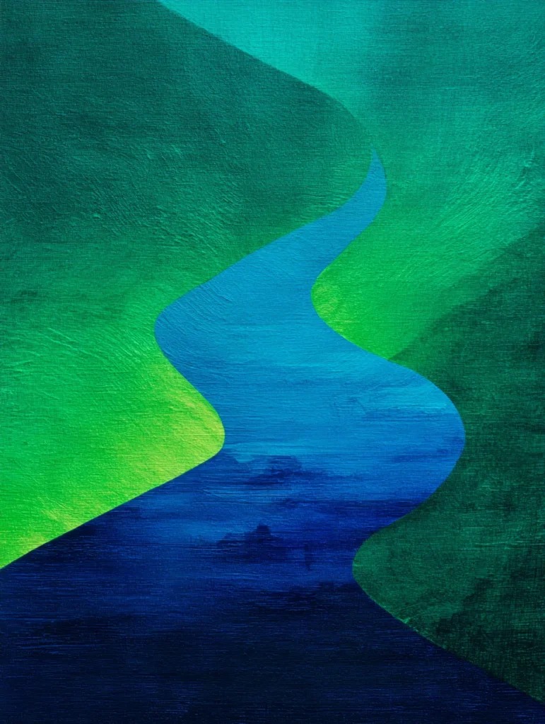 This abstract landscape has a vibrant blue river that snakes through a lush green valley with a clean and curvy layout. The water is a mix of bright azure and deep cobalt tones applied with horizontal strokes that give it a sense of quiet movement. Surrounding the river are rolling hills in various shades of emerald, lime, and forest green that use soft diagonal brushwork to suggest a velvety texture. It is a very simple yet effective composition that uses high contrast colors to lead your eyes from the bottom of the canvas all the way to the top.
