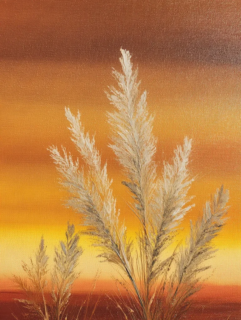 I am genuinely obsessed with how these textured white strokes make the grass practically leap off the canvas. Making those wispy plumes is a total blast because you can be a bit messy and still end up with something that looks incredibly high-end. It feels so relaxing to work with such a warm and inviting color scheme while practicing your fine brush details. You will love how this piece brings a touch of boho chic and a sense of calm to a sunny living room or an entryway.
