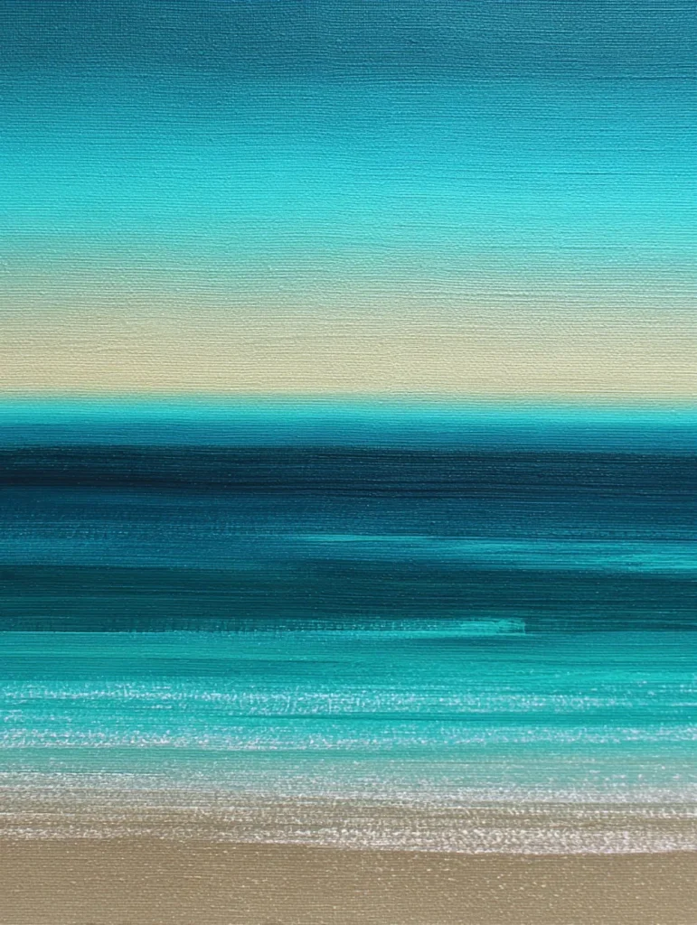 This design captures the essence of a peaceful day at the beach through soft horizontal bands of color. The top begins with a bright turquoise sky that gradually fades into a pale sandy yellow before meeting the deep teal and navy blues of the ocean. White textured paint creates the illusion of gentle waves crashing against a neutral beige shoreline at the bottom. The brushstrokes are long and fluid, which gives the entire composition a calm and breezy layout that feels incredibly open.