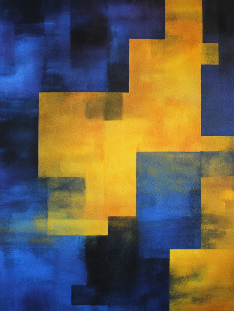 I am impressed by how these bold rectangular forms create such a high-end gallery look without needing any complex details. Some people love the challenge of masking off perfect lines, but you can also keep it loose and freehand these shapes for a more organic vibe. It feels incredibly satisfying to layer the bright yellow over the dark blue and watch the new shades emerge where they meet. This piece would be a total showstopper in a modern entryway or above a sleek velvet sofa.