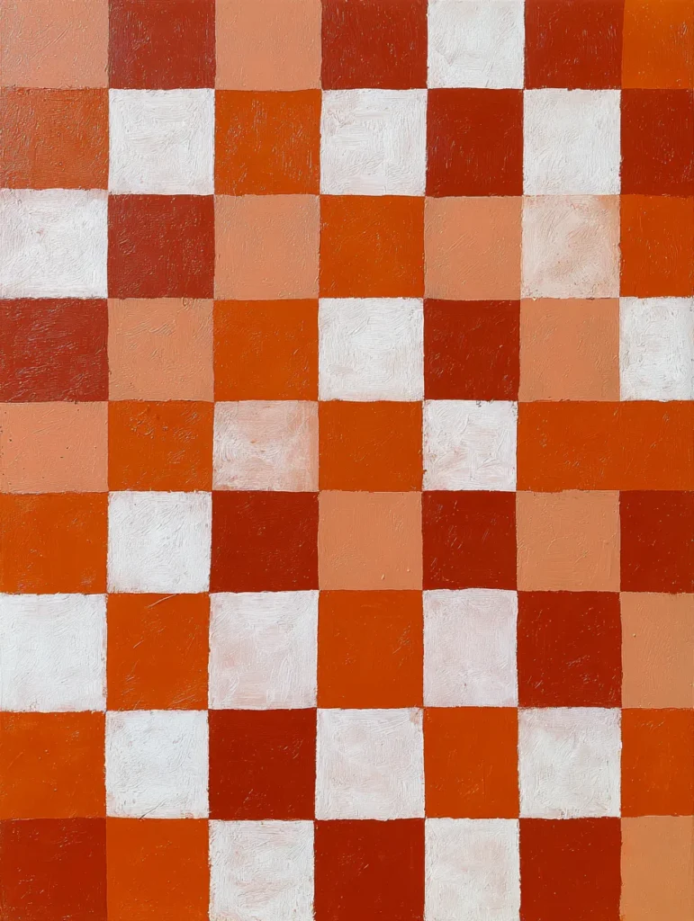 This design has a charming checkerboard pattern that fills the entire canvas with a warm, earthy energy. The palette is a cozy mix of burnt orange, terracotta, and soft peach, interspersed with crisp white squares that provide a bright contrast. Each square has a thick, painterly texture with visible brush strokes and slightly irregular edges, giving the geometric layout a handcrafted and rustic feel. The overall composition is structured and repetitive, yet the variation in pigment density within each block keeps the eye moving across the surface.