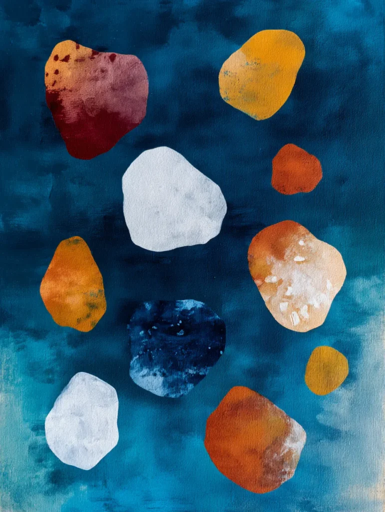 This artistic design features ten organic, smooth shapes that resemble polished river stones floating against a deep, watery backdrop. The background is a moody teal and navy blue, applied with soft, hazy washes that create a sense of underwater depth and mystery. The “pebbles” themselves are a rich variety of earthy tones, including deep burgundy, mustard yellow, burnt orange, and two striking white stones that provide a clean, bright contrast. Each stone has a subtle, mottled texture, with some showing highlights that look like light reflecting off a wet surface.