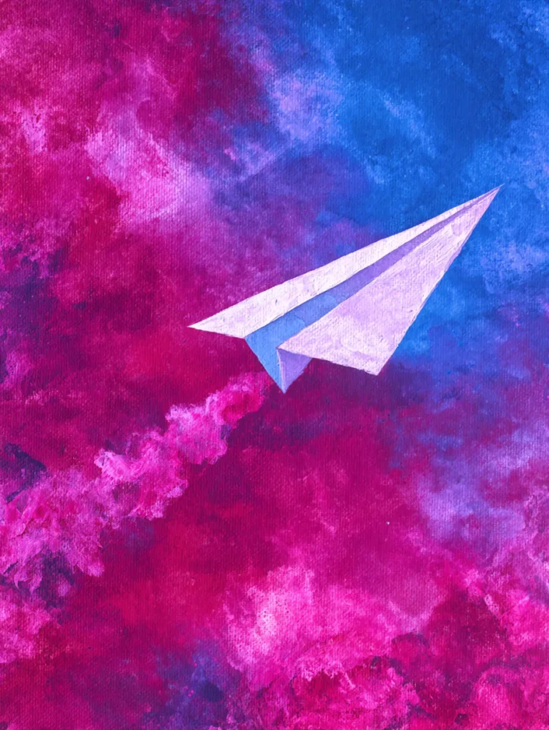 I think this painting is the perfect way to wrap up your collection because it combines a playful, nostalgic subject with a very bold and modern color palette. Working on the background is a great chance to let your emotions guide your brush, swirling those rich pinks and blues together until they feel just right. It is incredibly satisfying to finish the piece with that crisp, geometric plane, creating a focal point that feels full of hope and adventure. This artwork would be a lovely, inspiring addition to a child’s room or a creative workspace.