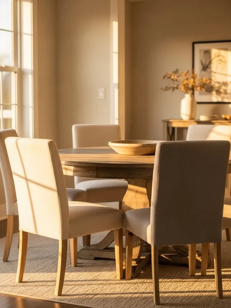 • Cozy Beige Dining Room with Soft Upholstered Seating