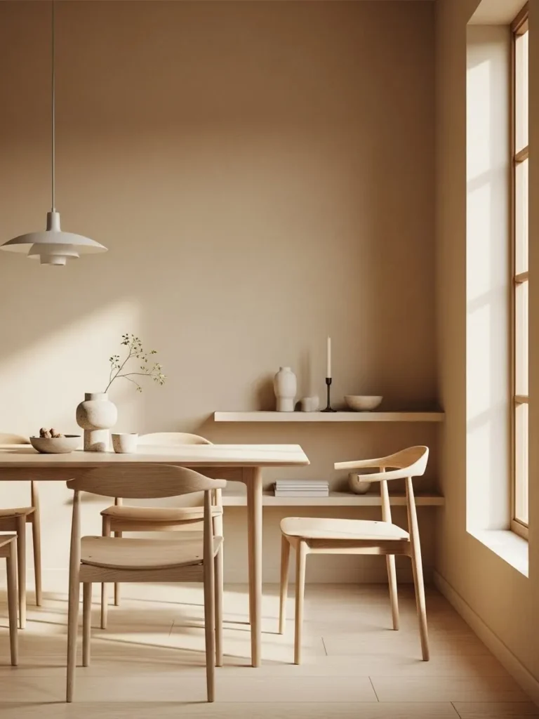 This dining room keeps things simple with smooth beige walls and clean wooden furniture. The neutral paint color adds warmth while letting the minimalist design shine. Large windows and open space keep the room feeling fresh and uncluttered. Beige works beautifully here as a soft backdrop.