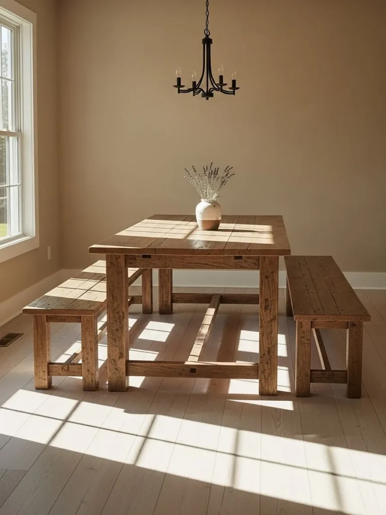 This dining room uses beige walls to soften the rustic wood table and benches. The paint color balances the heavier furniture and keeps the room feeling light. Natural light pours in and brings warmth to both the walls and the wood tones. The overall look feels grounded, cozy, and welcoming.