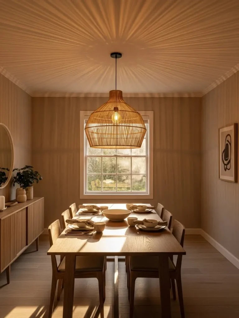 This dining room leans into beige walls paired with warm wood tones and textured details. The ceiling and pendant light add extra depth and character. Natural light fills the room and makes the beige feel rich and comforting. Everything feels coordinated without feeling too styled.