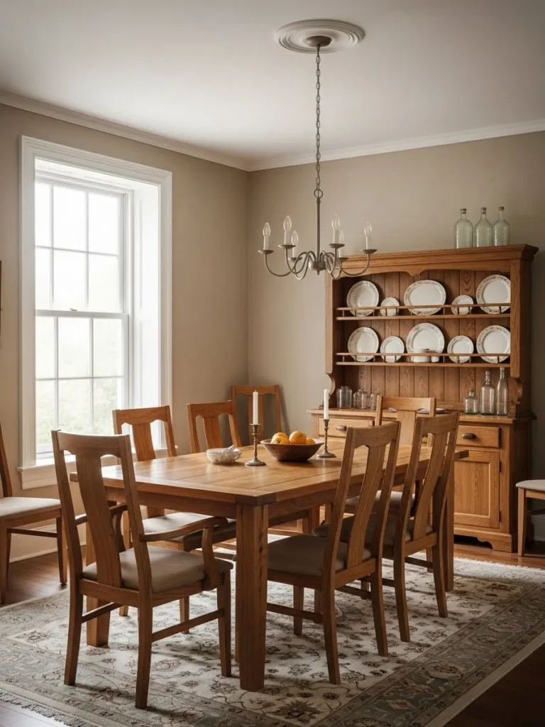 I love how timeless this room feels. The beige walls make the wood tones look even richer. It reminds me of family dinners that feel familiar and comforting. This is the kind of space that never feels dated.