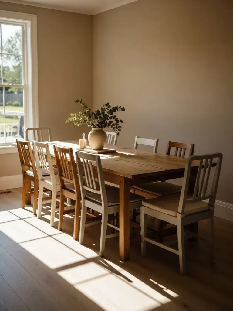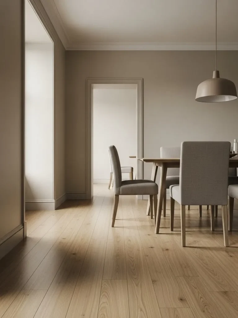 This dining room uses a light beige wall color that instantly makes the space feel calm and open. Natural wood floors and a simple wooden table add warmth without overpowering the room. White chairs and minimal decor keep the look fresh and balanced. The beige paint works beautifully with the natural light coming in from the window, creating a soft and relaxed atmosphere.