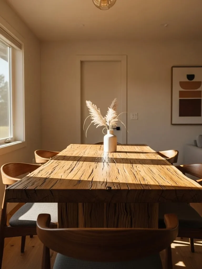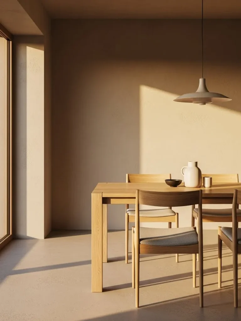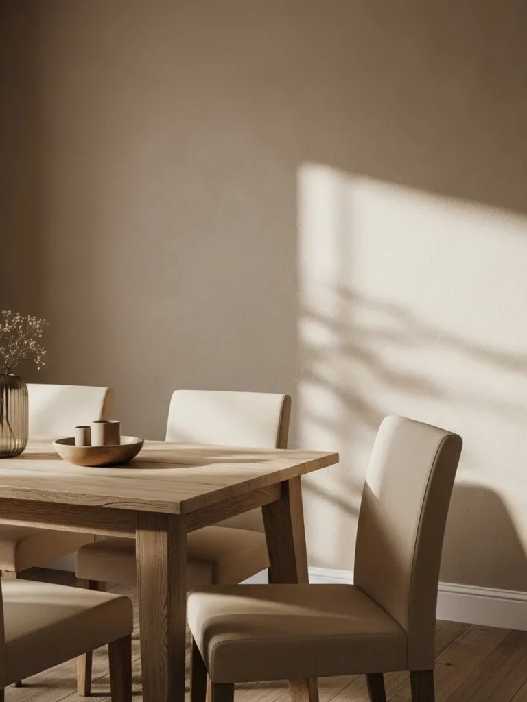 This dining room uses beige walls to highlight the natural texture of the wooden table. Sunlight streams in and adds warmth to every surface. Minimal decor keeps the focus on light and color rather than clutter.