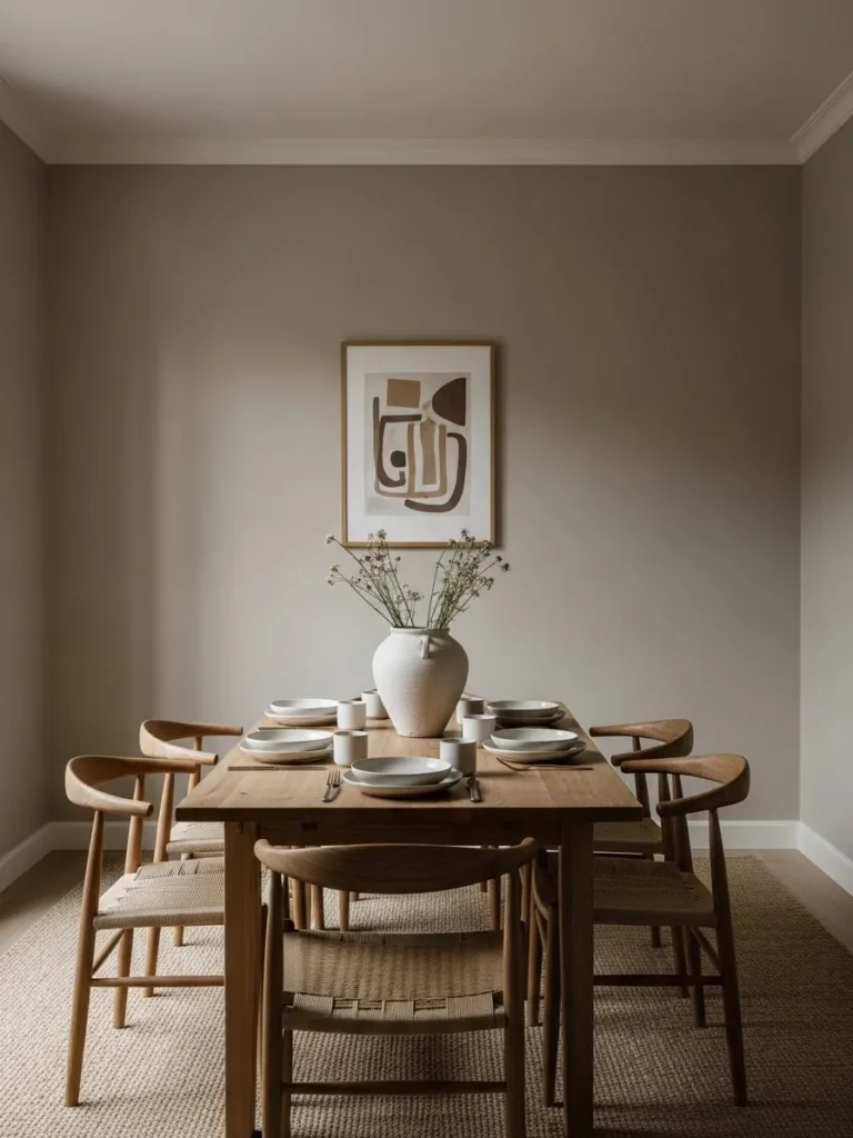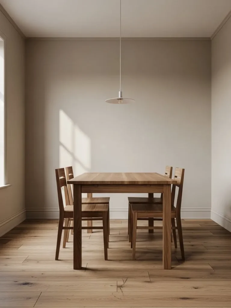 This dining room keeps things very simple with beige walls and a small wooden table. The layout feels intentional and uncluttered. Natural light highlights the softness of the paint color and makes the space feel calm.