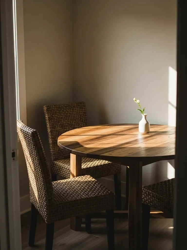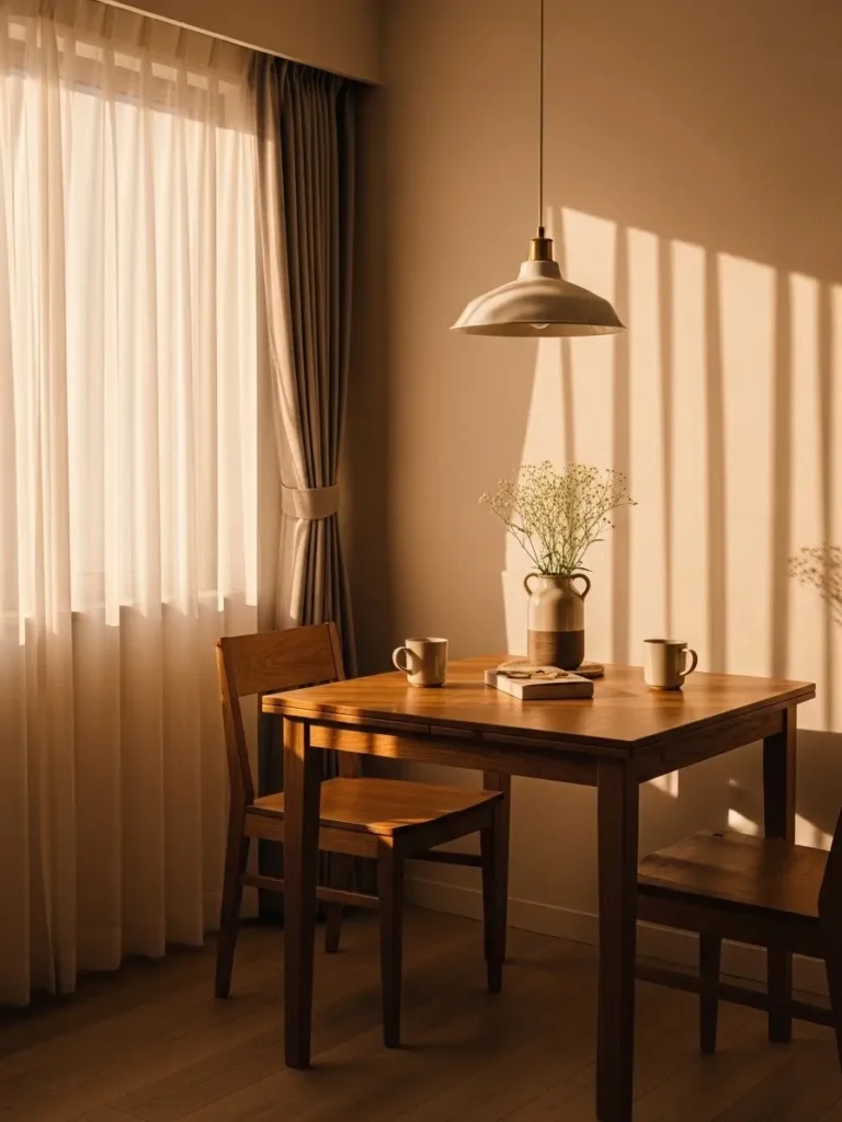 I am drawn to how grounded this space feels. The beige walls make the room feel calm and steady. It feels perfect for slow meals and quiet moments. There is something very comforting about it.