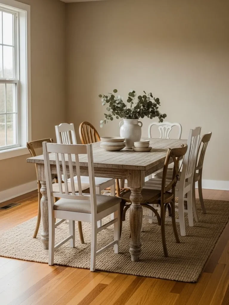 • Rustic Beige Dining Room with Cozy Farmhouse Feel