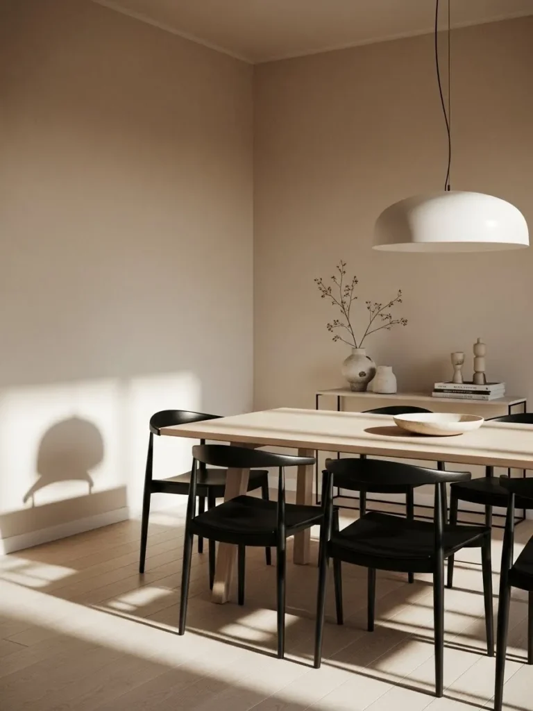 This dining room pairs warm beige walls with darker furniture for a modern and structured look. The clean lines of the table and chairs give the space a contemporary feel, while the beige paint keeps it from looking too sharp. Sunlight casts soft shadows across the walls, adding depth and warmth. The overall design feels thoughtful and uncluttered.