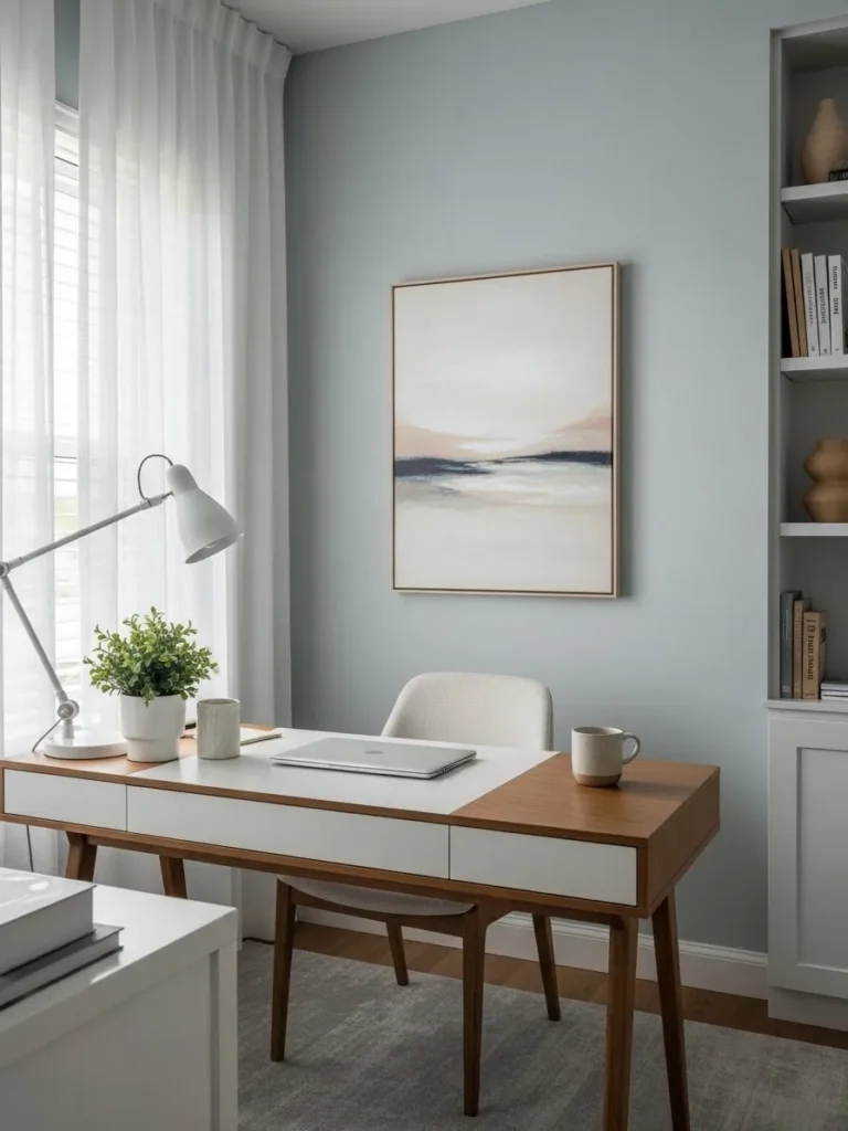 This home office uses a soft blue gray wall color that instantly feels calm and grounded without looking cold. The paint pairs beautifully with warm wood furniture, crisp white accents, and simple styling that keeps visual noise to a minimum. Natural light filters through sheer curtains and softens the entire space, while the clean desk lines and neutral artwork help everything feel intentional and uncluttered. It is the kind of setup that makes sitting down to work feel organized before you even open your laptop.