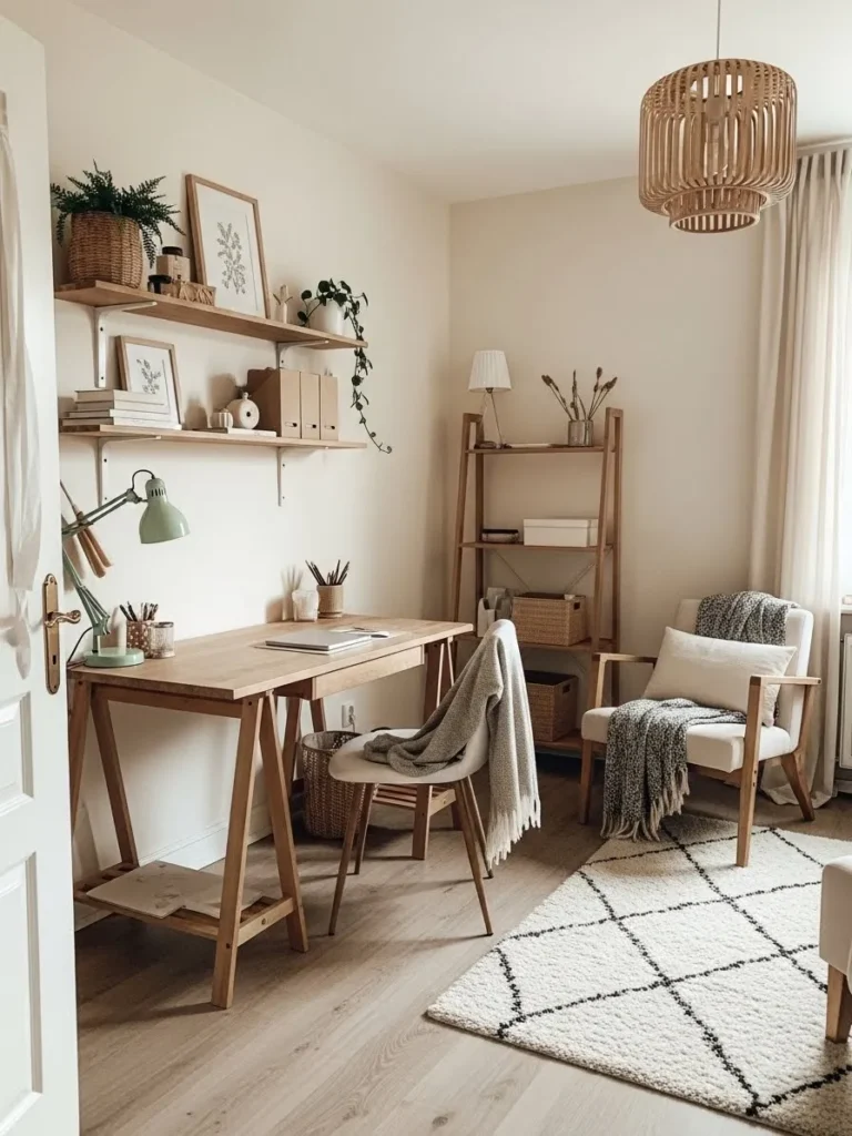 This home office feels calm and grounded thanks to its soft warm neutral walls that instantly make the space feel light and cozy. Natural wood takes center stage here with a simple wooden desk, open shelving, and a matching storage ladder that all add warmth without feeling heavy. The creamy walls pair beautifully with woven textures like the pendant light, baskets, and rug, creating a relaxed Scandinavian vibe that feels organized but not overly styled. Plenty of natural light filters through the curtains, which keeps the room bright and airy while still feeling gentle on the eyes during long workdays.