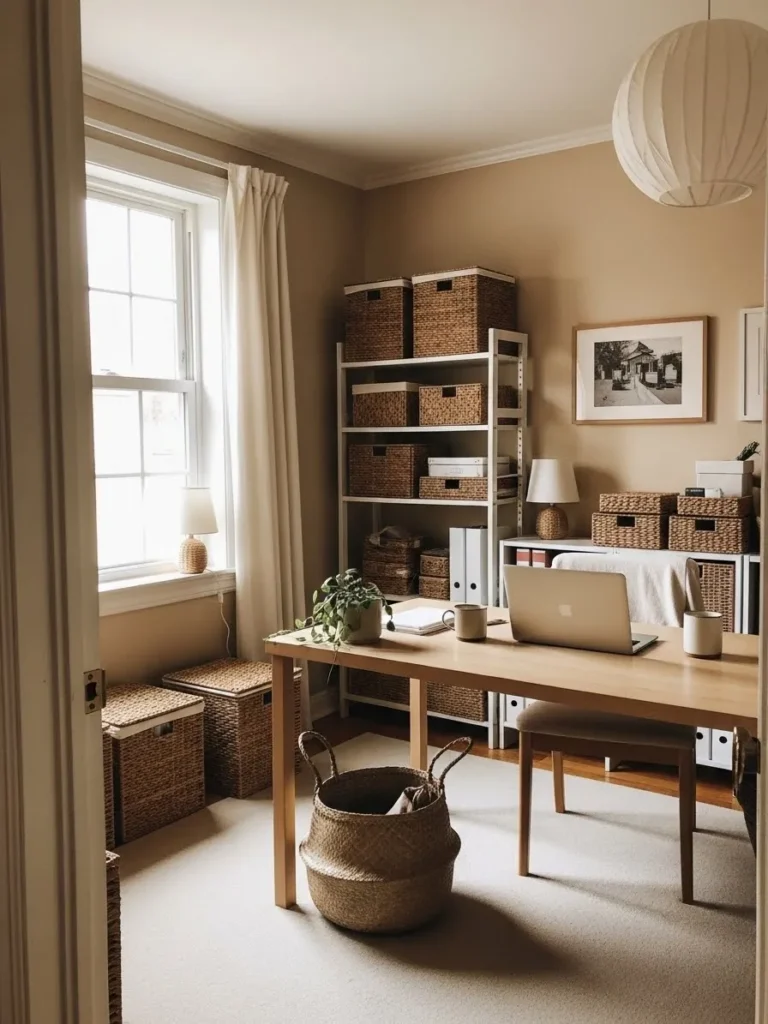 This home office leans into a warm beige color palette that instantly feels calm and grounded without looking flat or boring. The walls have that soft sandy tone that reflects natural light beautifully and makes the whole room feel cozy yet focused. Woven storage baskets are everywhere in the best way possible and they add texture while keeping clutter out of sight. Light wood furniture keeps the space feeling airy and balanced and the simple desk setup feels intentional rather than overstyled. Soft curtains frame the window just enough to filter daylight while still keeping things bright and productive.