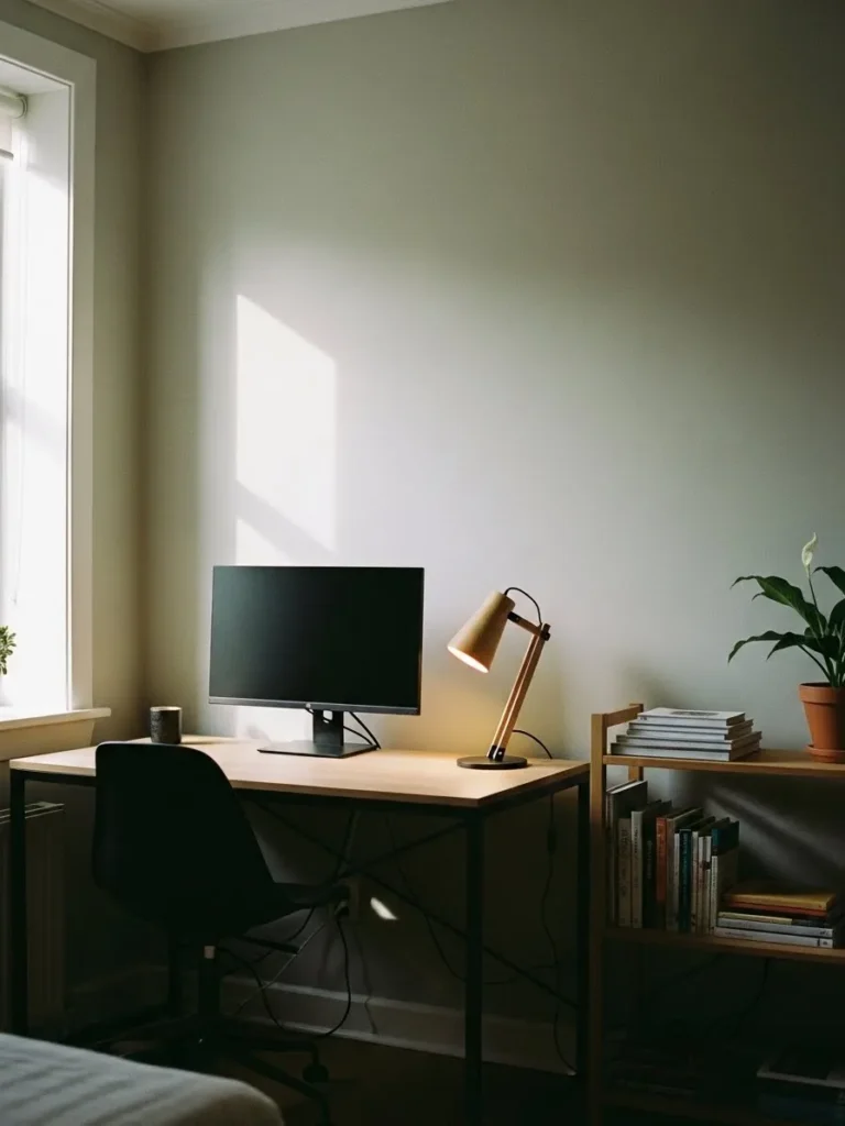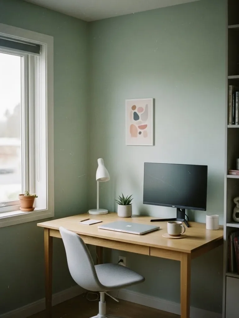 This home office keeps things calm and uncomplicated with soft sage green walls that instantly make the space feel grounded and fresh. The light wood desk adds warmth without feeling heavy, while the white chair and simple desk lamp keep the look airy and clean. Natural light from the window does most of the heavy lifting here, bouncing beautifully off the muted wall color and making the whole setup feel open and breathable. A few minimal accessories like a small plant, framed abstract art, and neatly styled shelves add just enough personality without distracting from focus time.