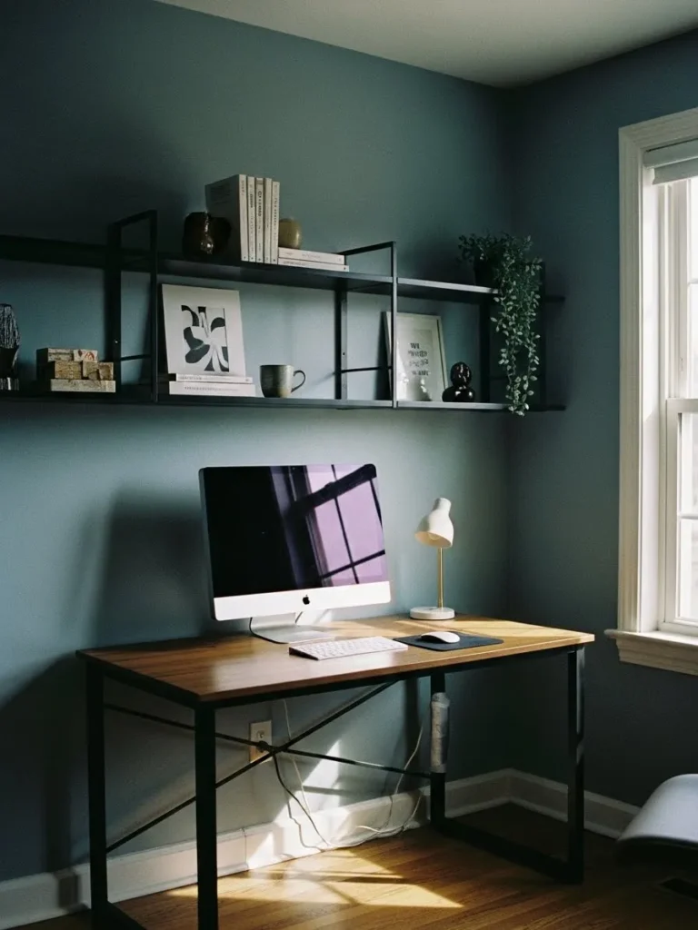 This home office features a deep blue paint color that feels calm, grounded, and quietly confident. The walls create a cozy backdrop for a simple wooden desk with slim black metal legs, giving the whole space a clean and modern vibe. Open shelving keeps things light and uncluttered, styled with a few books, art prints, and trailing greenery so it never feels sterile. Natural light from the window softens the darker wall color and adds just enough brightness to keep the space feeling focused rather than heavy.