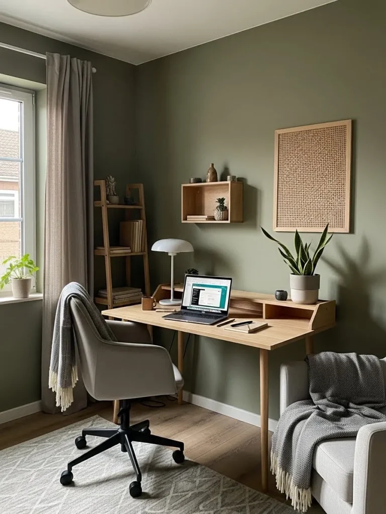 I honestly love how effortlessly peaceful this setup feels. It is the kind of office that makes you want to sit down with a coffee and actually enjoy getting things done. The sage green is soothing without being boring and it plays so nicely with the wood tones and soft light. For me this design proves that you do not need bold colors or fancy furniture to create a productive workspace. Sometimes calm and simple is exactly what your brain needs to focus and feel good while working.