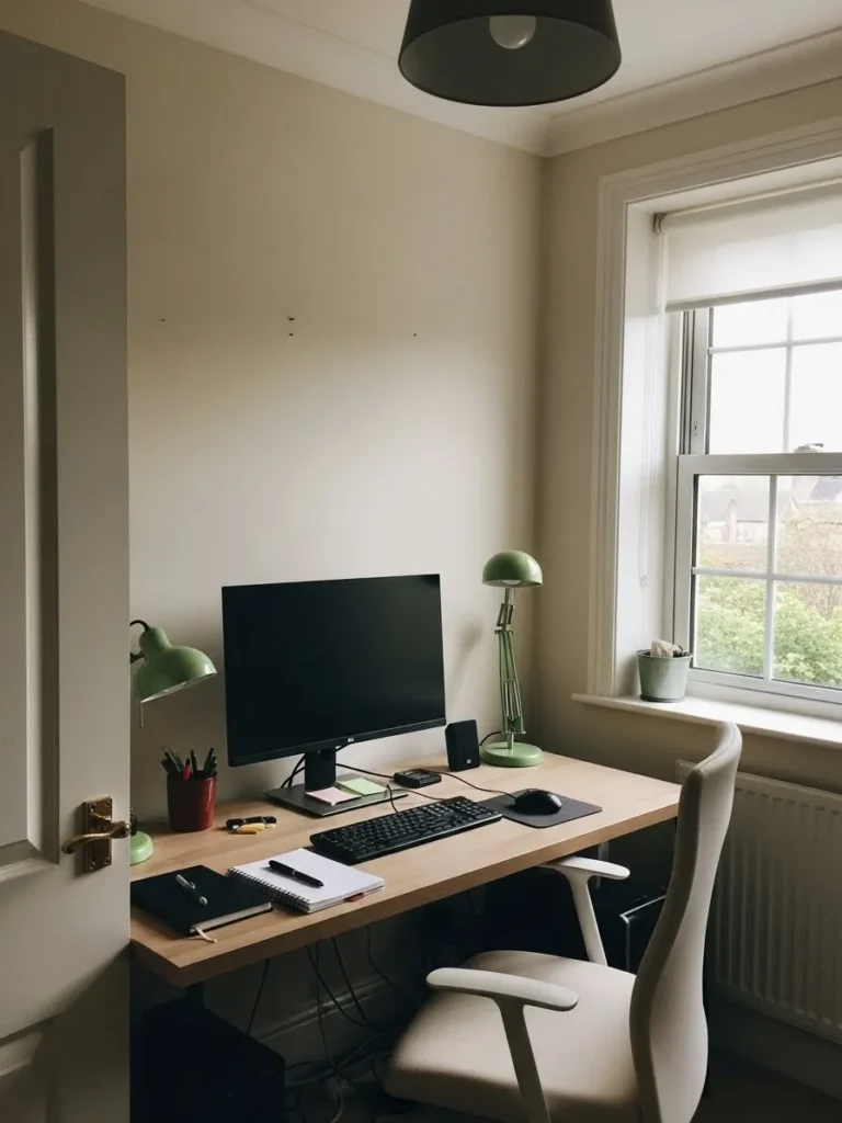 This home office keeps things calm and focused with soft beige walls that gently reflect natural light from the window. The color palette leans warm and neutral which makes the space feel airy without being stark. A simple wooden desk anchors the room while light upholstery on the chair adds a cozy touch. The green desk lamps bring in just enough contrast to keep the space from feeling flat and they quietly echo the view outside. Everything feels intentional but not overstyled which is perfect for a productive workday.