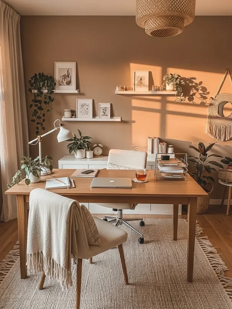 I honestly love how peaceful this setup feels because it looks like a place where focus comes naturally. The warm neutral paint makes everything feel welcoming instead of cold, which is exactly what I want when I sit down to work. I can picture myself lighting a candle, wrapping up in that cozy throw, and actually enjoying my to do list for once. It feels productive without trying too hard, and that effortless calm is what makes this design so beautiful to me.