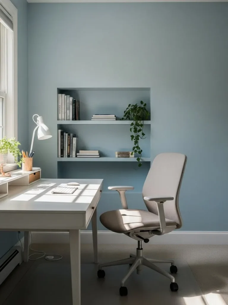 This home office feels calm and quietly confident thanks to those soft blue walls that instantly cool the room without feeling cold. The built in shelving keeps everything looking tidy but still lived in with neatly stacked books and a trailing plant adding just the right touch of life. A simple white desk and an ergonomic chair keep the setup practical and uncluttered while natural light pours in and bounces beautifully off the pale surfaces. It is the kind of space that feels organized but never stiff which is honestly the sweet spot for productivity.