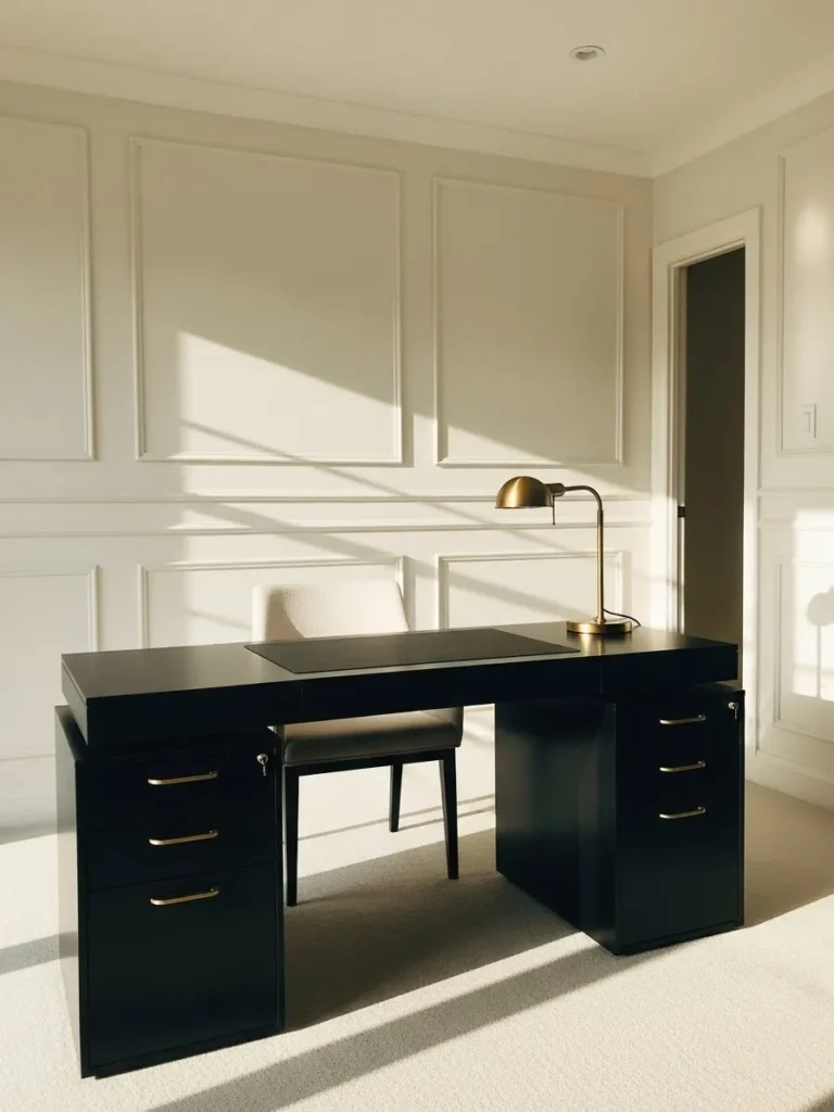 This home office design feels calm and intentional thanks to soft cream walls paired with elegant wall paneling that adds just the right amount of structure. The color choice reflects natural light beautifully and keeps the space feeling open without looking stark or cold. A sleek black desk anchors the room and creates a strong contrast against the light walls while brass accents like the desk lamp and drawer pulls add warmth and polish. Everything feels balanced and uncluttered which makes the space perfect for focused work without visual noise pulling your attention away.