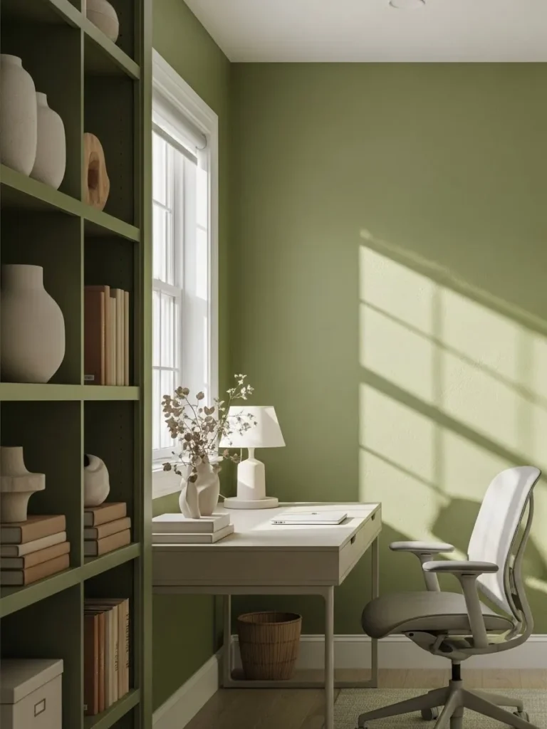 This home office uses a soft sage green that instantly makes the space feel grounded and calm without being boring. The walls have a gentle earthy tone that pairs beautifully with the white desk and shelving which keeps everything feeling light and fresh. Built in shelves painted to match the walls create a seamless look and add plenty of room for books and simple decor. Natural light pours in through the window and casts soft shadows across the room which makes the whole space feel airy and peaceful. The clean lined desk and ergonomic chair keep the setup practical while still looking stylish and uncluttered.