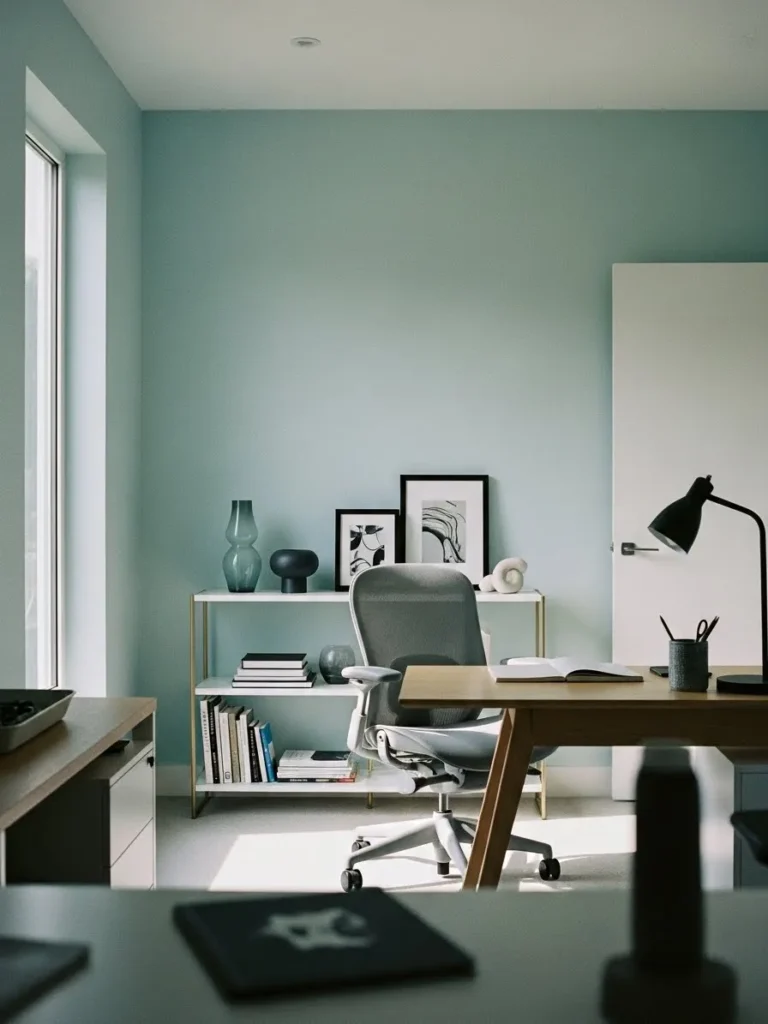 This home office feels calm the second you look at it, thanks to those beautiful blue green walls that instantly soften the space. The color sits right between cozy and refreshing, which makes it perfect for focus without feeling cold or boring. Natural light streams in from the side window and plays so nicely with the muted wall tone, while the warm wood desk adds just enough contrast to keep things grounded. The clean lined furniture, gentle curves on the chair, and minimal decor keep everything feeling uncluttered and intentional, which is honestly a dream setup for getting real work done.