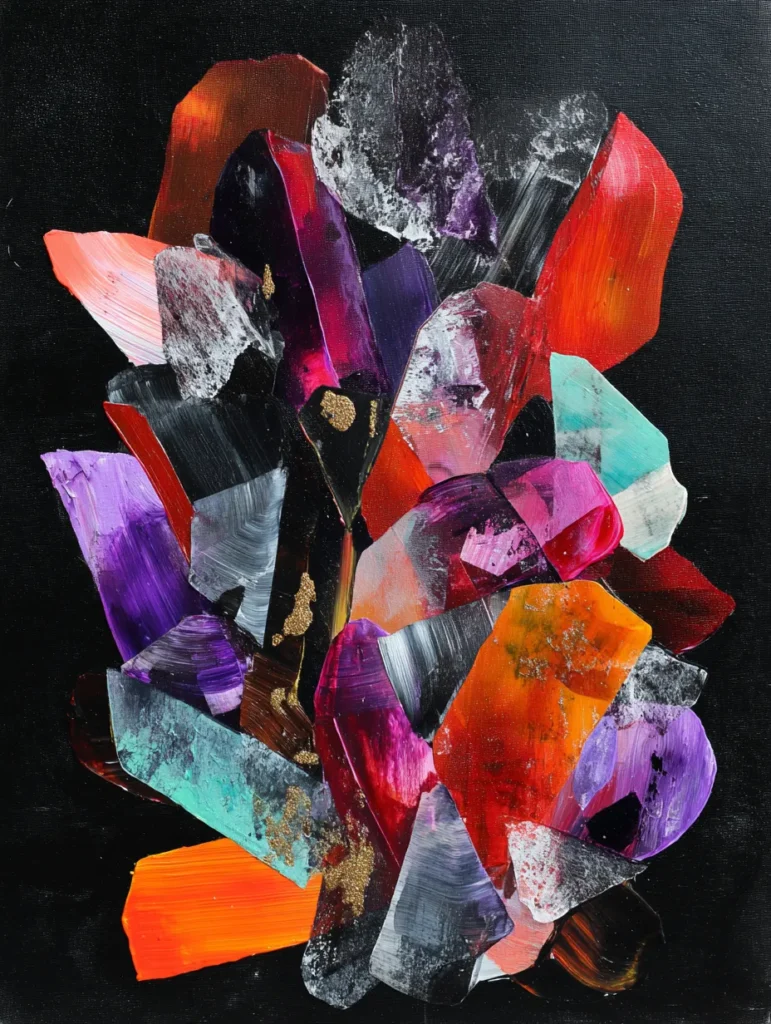 Thick palette knife strokes create a stunning cluster of gem-like shapes that pop against the deep black background. This design features a rich mix of magenta, royal purple, and fiery orange balanced by cool teal and shimmering gold accents. Each geometric shard has a textured, layered look that makes the colors feel like they are vibrating. The composition is centered and vertical, resembling a beautiful pile of raw crystals or shattered stained glass.