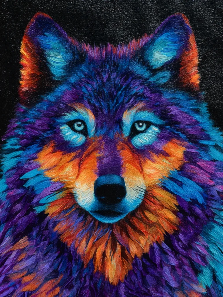 Bold streaks of violet, cobalt blue, and fiery orange create a majestic wolf that practically glows against the dark background. Short and thick brushstrokes mimic the texture of dense fur, while light teal highlights around the eyes and snout add a mystical quality. The front-facing composition is tight and impactful, focusing on the piercing light blue eyes that anchor the entire piece. Every color choice feels intentional, turning a traditional animal portrait into a modern and energetic work of art.