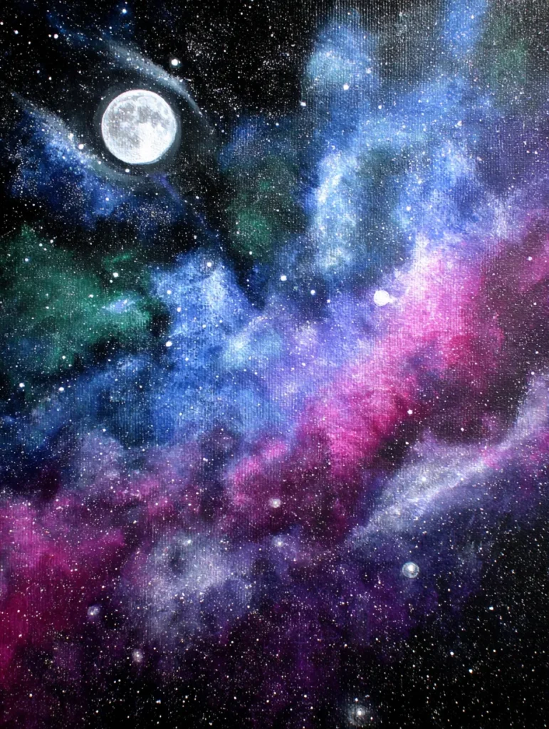 A bright full moon hangs in the upper corner of this cosmic scene, casting a cool glow over swirling clouds of magenta, deep emerald, and sapphire blue. Soft and hazy blending creates a gaseous appearance for the nebula, while thousands of tiny white splatters represent a dense field of distant stars. The diagonal flow of the colors creates a sense of vast and infinite space, making the textured surface of the moon a sharp and realistic focal point against the dark canvas.
