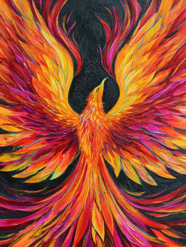 A legendary phoenix spreads its wings in a powerful display of oranges, magentas, and golden yellows. Long and sweeping brush strokes create the appearance of flickering flames within the feathers, while bright yellow highlights along the wing tips add a sense of intense heat. The symmetrical layout centers the bird on the dark canvas, making the upward motion of the tail and wings feel incredibly dynamic and full of life. It is a bold composition that uses high contrast to give the mythical creature a truly radiant and modern look.
