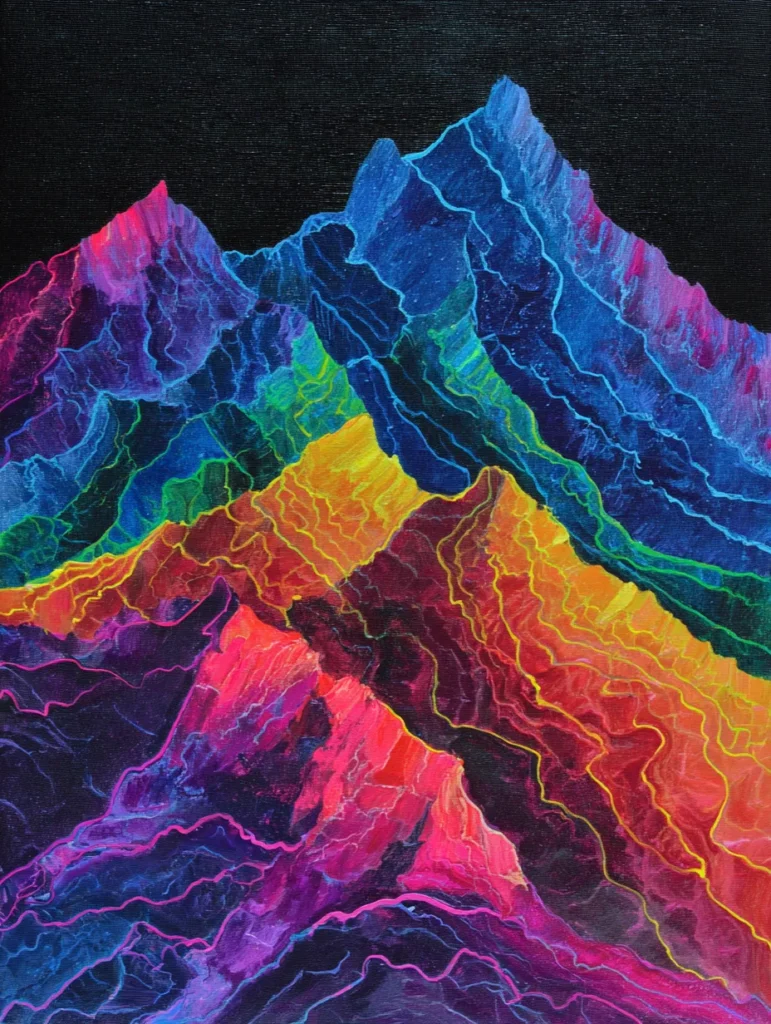 Stunning ridges in electric lime, hot pink, and deep indigo create a jagged mountain range that slices through the dark canvas. Thin and squiggly brush strokes mimic topographic lines or glowing veins of energy that trace the physical contours of each slope. The composition is layered from bottom to top, with warmer oranges and reds in the foreground giving way to cool blues at the highest summits. This approach turns a traditional landscape into a vibrant and futuristic piece of map-inspired art.