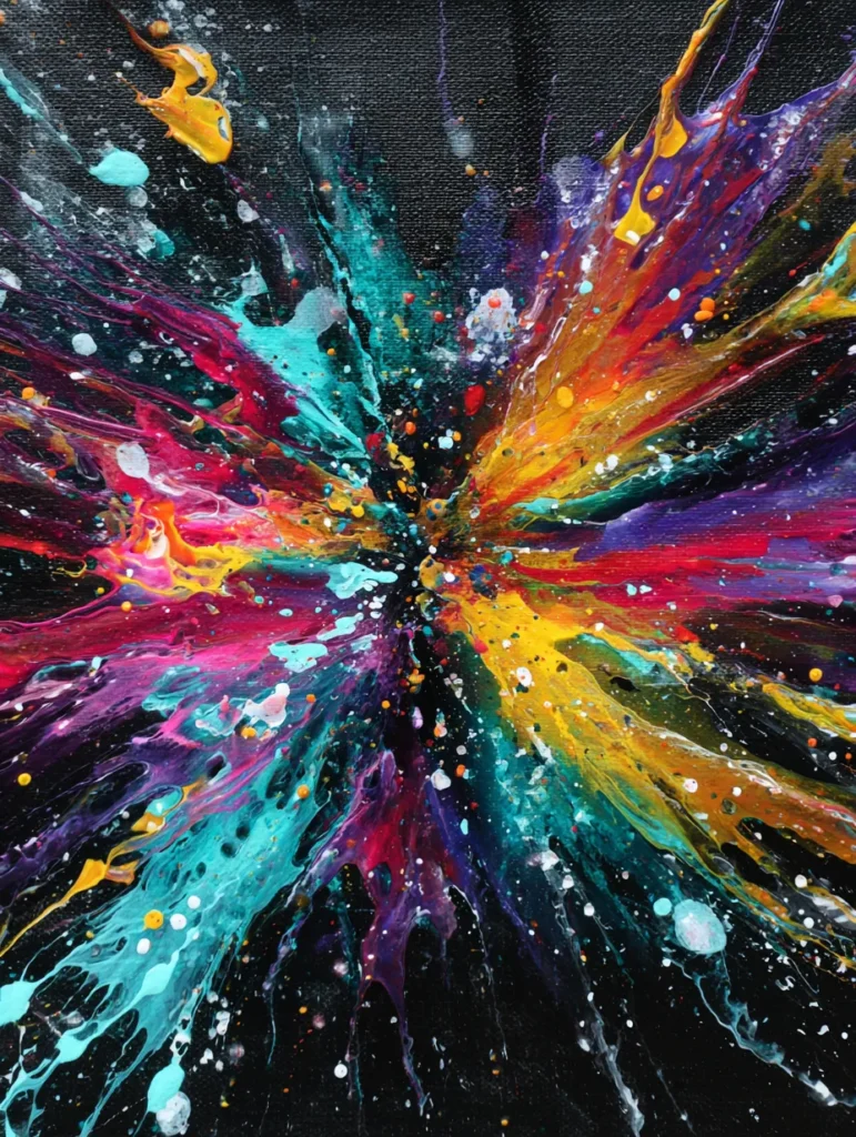 Thick ribbons of mustard yellow, magenta, and teal burst outward from a dark central point in a high-energy starburst effect. The design features a mix of fluid pours and delicate splatters that create a sense of rapid movement across the black canvas. Each streak of color is layered with smaller droplets of white and orange, giving the chaotic composition a multidimensional and professional look. It is a striking piece that captures the raw energy of a color explosion in a perfectly balanced and centered layout.