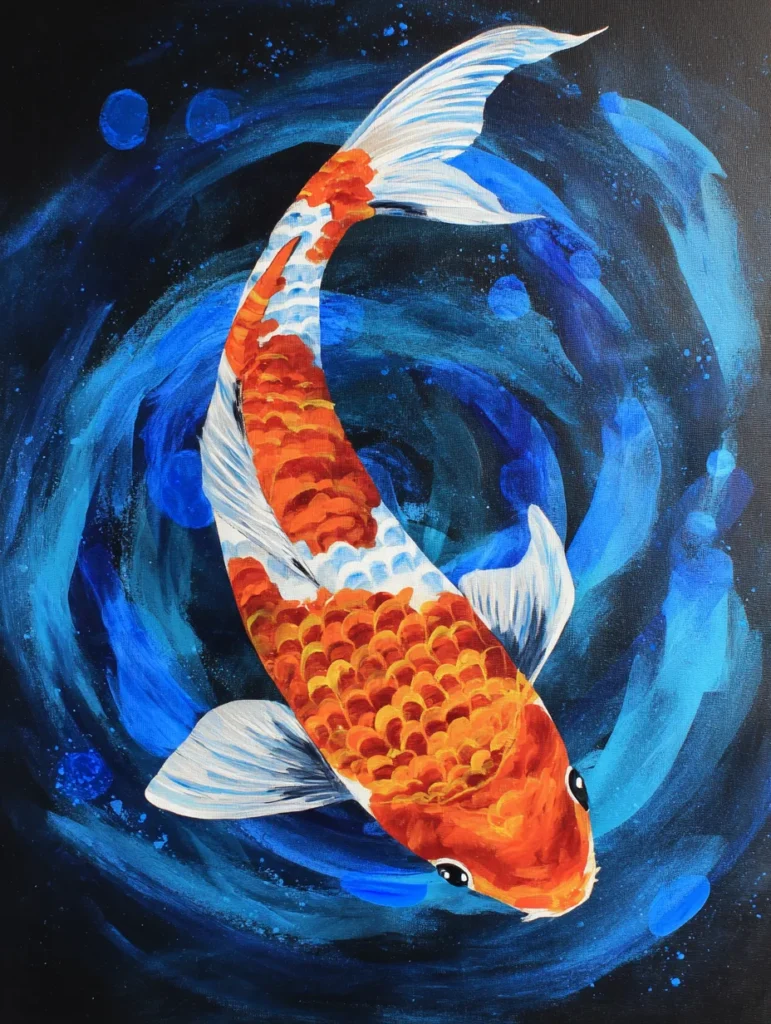 A bright orange and white koi fish curves gracefully across the canvas, surrounded by a whirlpool of sapphire and cobalt blue. Thick, scalloped brush strokes create the realistic texture of scales on the fish, while lighter white highlights add a shimmering effect to the fins. The circular composition of the background water suggests a gentle current, making the vibrant orange body pop intensely against the dark, swirling depths. This layout uses a beautiful contrast between warm and cool tones to create a peaceful yet energetic aquatic scene.