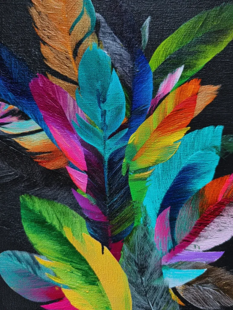 A lush cluster of stylized feathers fan out across the canvas in a brilliant array of emerald green, turquoise, and magenta. Each plume features fine and rhythmic brush strokes that create a soft and realistic texture, while bold pops of tangerine and gold add a sun-kissed warmth to the arrangement. The overlapping layout builds a wonderful sense of volume, making the feathers appear as if they are floating gently in a dark and quiet space. This vertical composition uses the stark black background to highlight the sharp contrast between the deep cool tones and the radiant warm highlights.